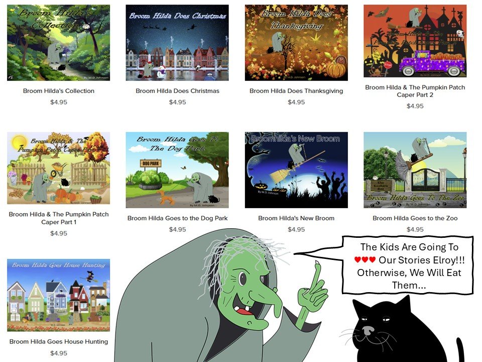 Broomhildaâs New Broom is a 48 page book just in time for Halloween! It showcases a witch named Broomhilda and her Cat Elroy who discover they must acquire a new broom when their old broomâs magic dissipates. Vocabulary enhancing words showcased in this book include: