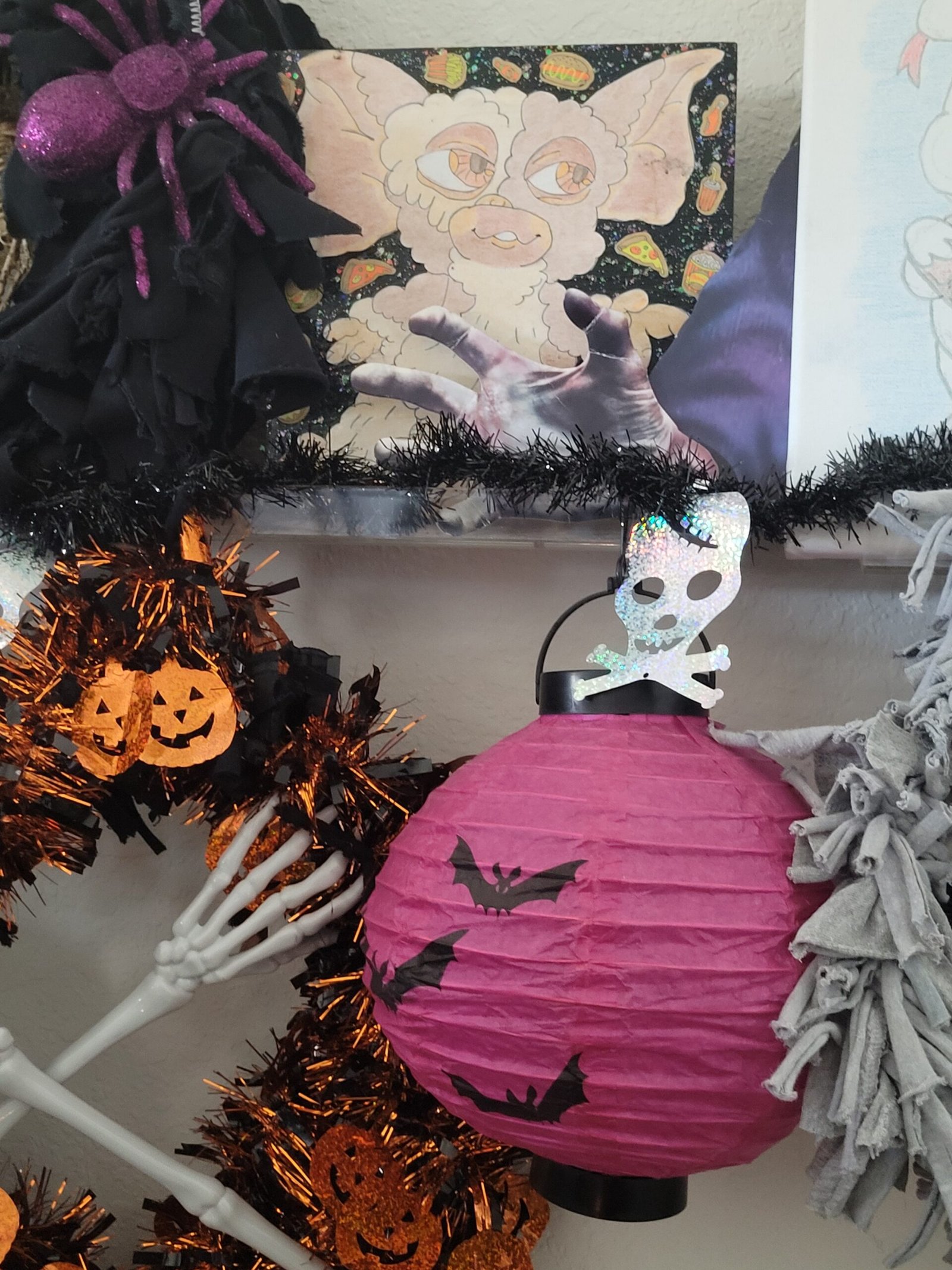 Truth be told, the 80s was where it was at when it came to Horror Movies! Next up Gizmo from Gremlins. I actually used a cheap old ugly art piece / picture from Goodwill / Thrift Store and painted it over in black paint and added glitter glue. Then I sketched out Gizmo on white sketch paper and colored it with colored pencil. Then glued it to the canvas, added food stickers from Daiso and Modge-Podged it. This I made a few years back, but it’s an easy cheap hack you can use to still Add Festive Halloween Decor to your Household on a Budget!