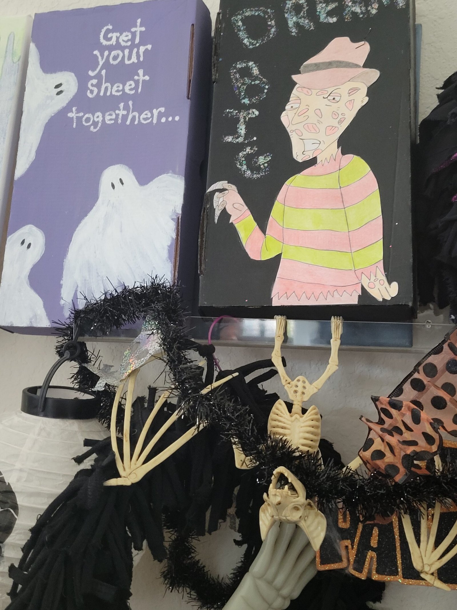 Pizza Box Couture Halloween Style. Dream Big in glitter glue with Freddy Krueger Sketch and Pencil Colored Art and the Ghostly statement art piece that adds a daily reminder for those who need it!