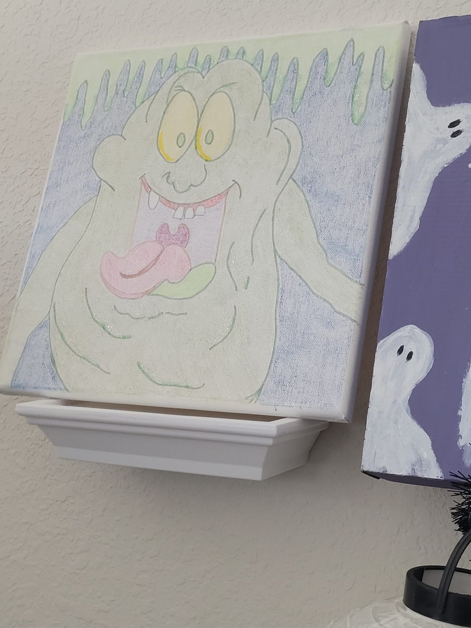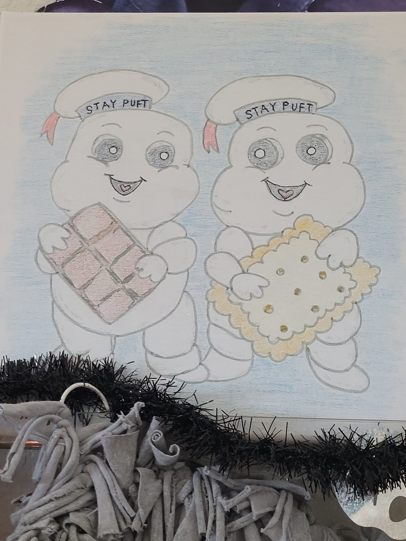 To create this Creepy Cute Baby Twin Marshmallow Man Image I simply took a deep dive into Pinterest to find the perfect image and sketched it out copy cat style and colored it in with colored pencil and used glitter puff paint for accenting the image. This was on Canvas and Yes you totally need to put on Ray Parker Jr.’s “Ghostbusters” song to catch the full VIBE on this craft. What goes better with marshmallows than a graham crackers and chocolate for some S’mores? Stay Puft!