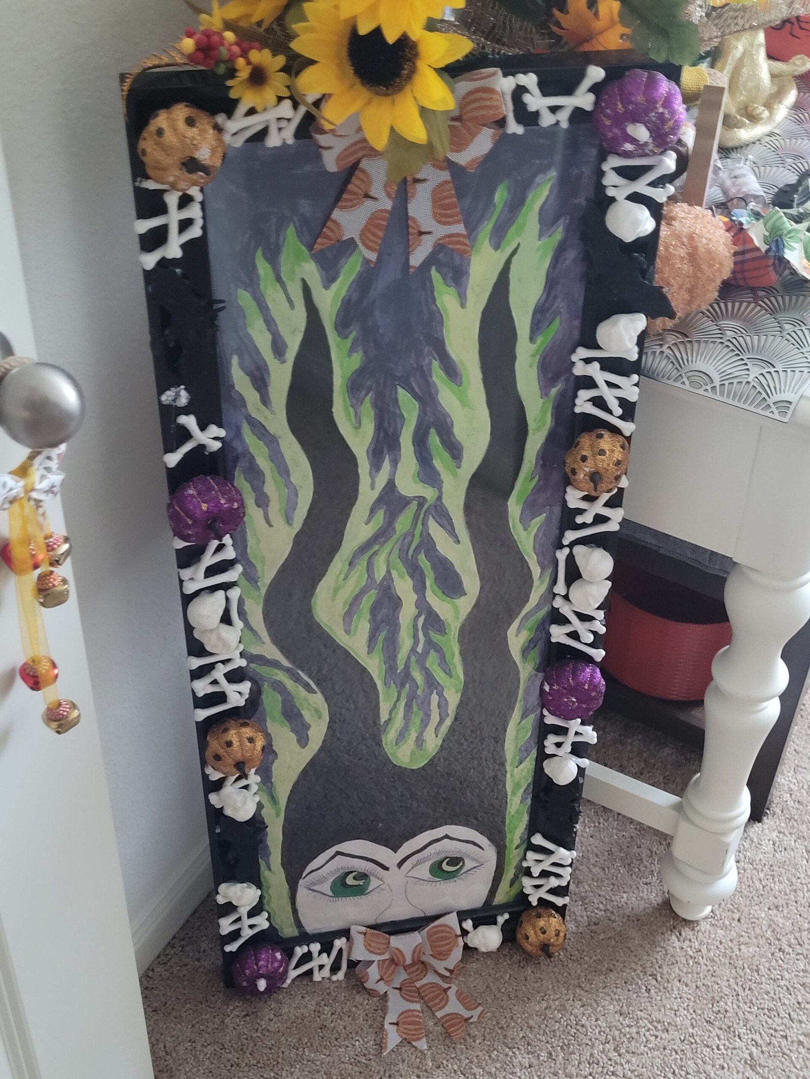 I love Maleficent, as she has an interesting storyline, so you can’t fault her for being who she is. So I did buy a long framed picture from Goodwill for under $7 and upcycled it by adding Dollar Tree accents to the frame to make it Halloweenesque and made a colorful painting on the reverse side of the image (which I don’t remember what it was, but it all worked out!