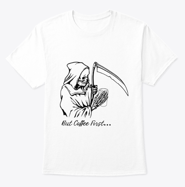 For the chronically exhausted, caffeine-powered, and emotionally unavailable—this “But Coffee First” Grim Reaper shirt speaks your soul. Featuring the Grim Reaper clutching coffee, this design delivers dark humor with relatable morning mood energy.